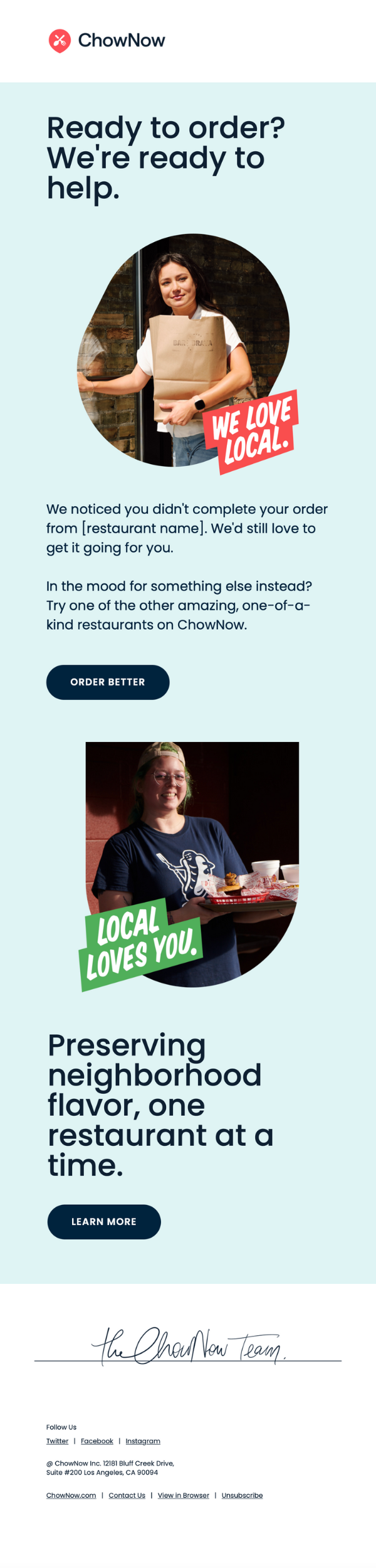In the ChowNow lifecycle experience, this email is sent after the order was started in the app, but the customer never finished the purchase.