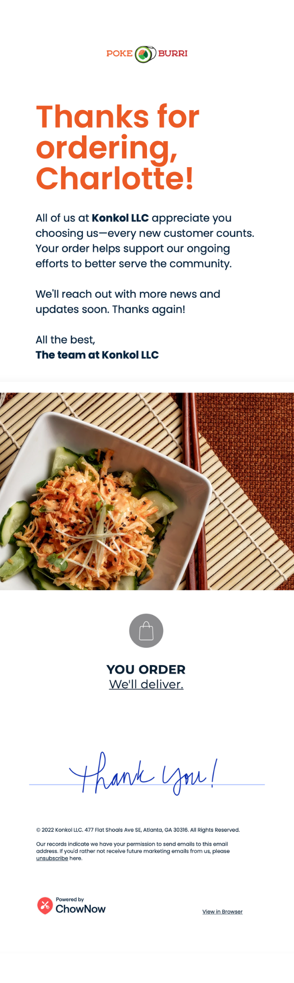 When a customer places their first order at a restaurant, this email is sent by ChowNow on behalf of the restaurant welcoming the customer and thanking them for their business.